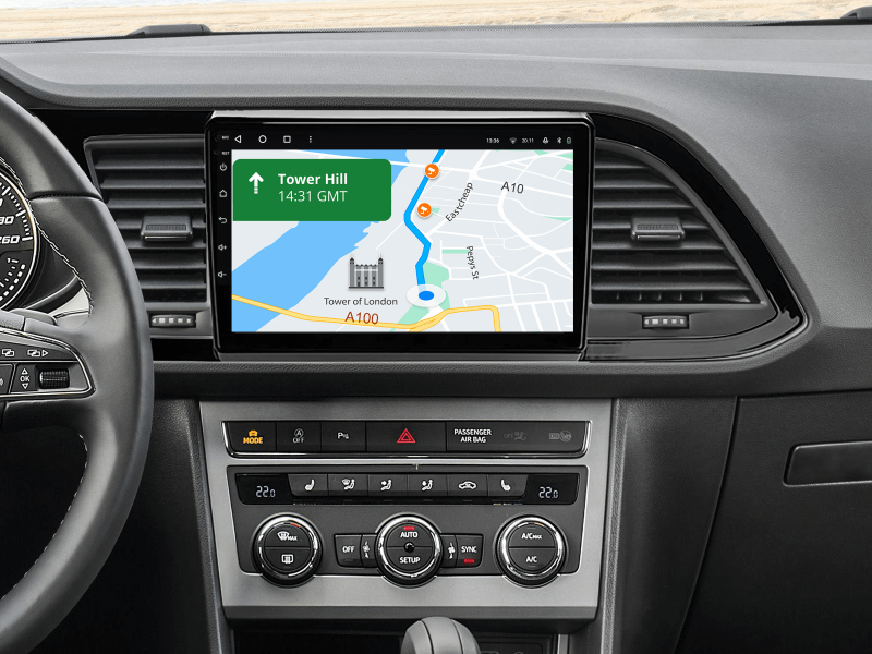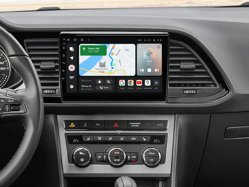 Отримайте Apple CarPlay, Android Auto, Google Maps та Wase навігацію з інформацією про затори на великому вбудованому екрані прямо у вашому автомобілі Seat Leon 2012-2020. Насолоджуйтесь YouTube, Netflix, Amazon, Disney, а також інтернет-радіо та потоковою музикою у вашому авто.