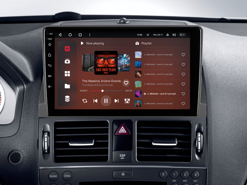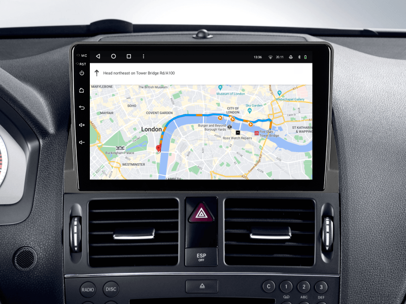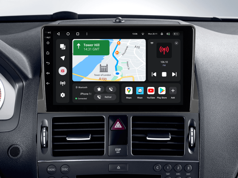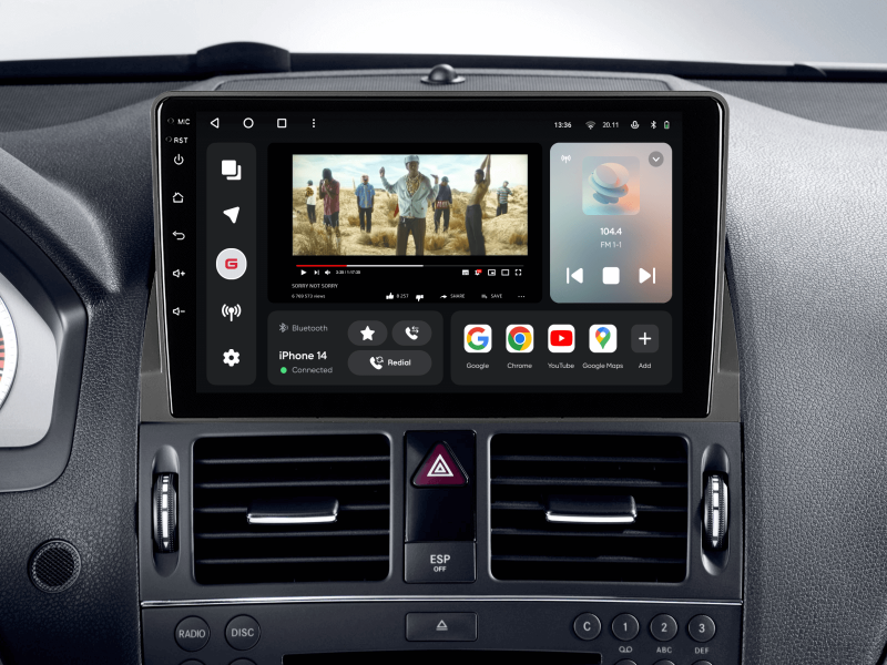 Отримайте Apple CarPlay, Android Auto, Google Maps та Wase навігацію з інформацією про затори на великому вбудованому екрані прямо у вашому автомобілі Mercedes-Benz C-Class 2006-2011. Насолоджуйтесь YouTube, Netflix, Amazon, Disney, а також інтернет-радіо та потоковою музикою у вашому авто.