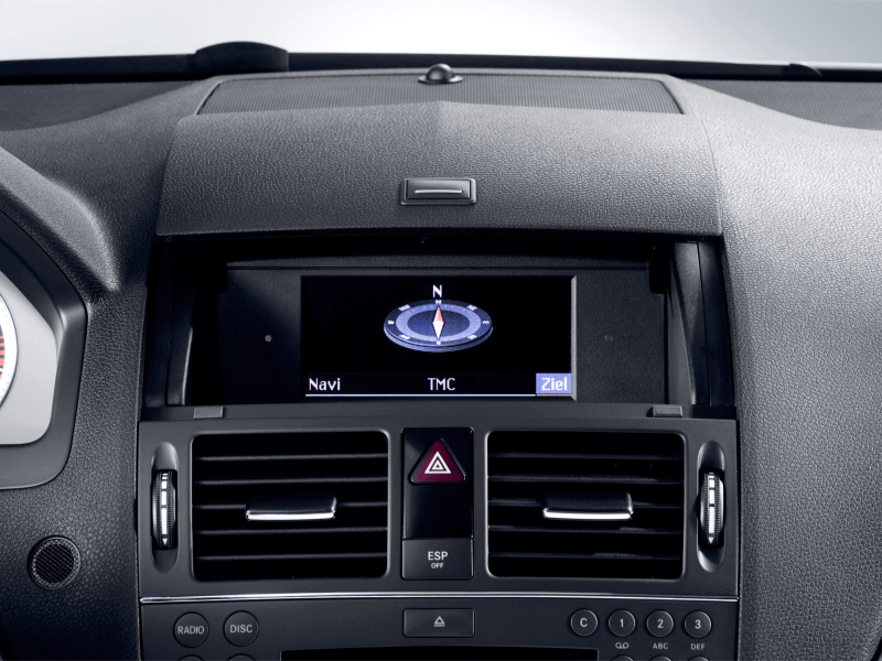 Камера переднього огляду доступна як опція. Замість передньої та задньої камер ви можете обрати систему кругового огляду. Якщо у вашому Mercedes-Benz C-Class 2006-2011 вже встановлена штатна камера заднього огляду, то вона буде підключена до мультимедійної системи. Так само підтримуються й оригінальні парктроніки, якщо вони встановлені на ваше авто.