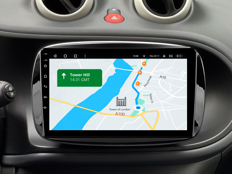 Отримайте Apple CarPlay, Android Auto, Google Maps та Wase навігацію з інформацією про затори на великому вбудованому екрані прямо у вашому автомобілі Smart Fortwo 2014-2020. Насолоджуйтесь YouTube, Netflix, Amazon, Disney, а також інтернет-радіо та потоковою музикою у вашому авто.
