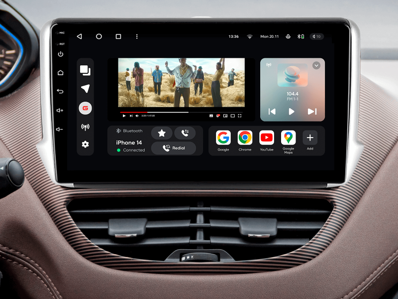 Отримайте Apple CarPlay, Android Auto, Google Maps та Wase навігацію з інформацією про затори на великому вбудованому екрані прямо у вашому автомобілі Peugeot 2008 2013-2020. Насолоджуйтесь YouTube, Netflix, Amazon, Disney, а також інтернет-радіо та потоковою музикою у вашому авто.