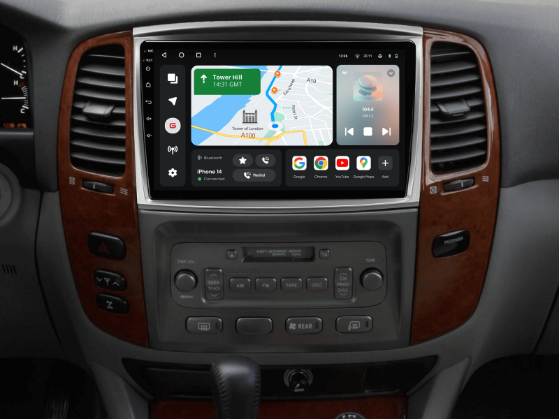 Отримайте Apple CarPlay, Android Auto, Google Maps та Wase навігацію з інформацією про затори на великому вбудованому екрані прямо у вашому автомобілі Toyota Land Cruiser 2002-2007. Насолоджуйтесь YouTube, Netflix, Amazon, Disney, а також інтернет-радіо та потоковою музикою у вашому авто.