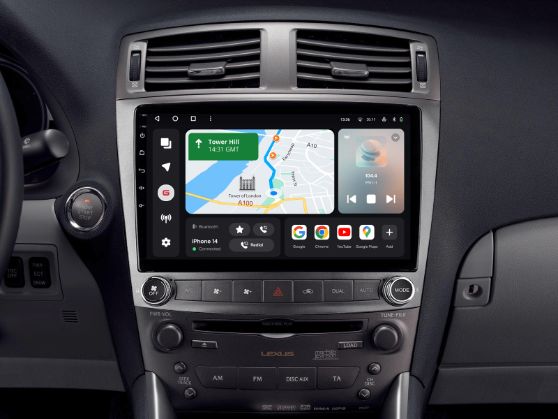 Отримайте Apple CarPlay, Android Auto, Google Maps та Wase навігацію з інформацією про затори на великому вбудованому екрані прямо у вашому автомобілі Lexus IS250 2005-2013. Насолоджуйтесь YouTube, Netflix, Amazon, Disney, а також інтернет-радіо та потоковою музикою у вашому авто.