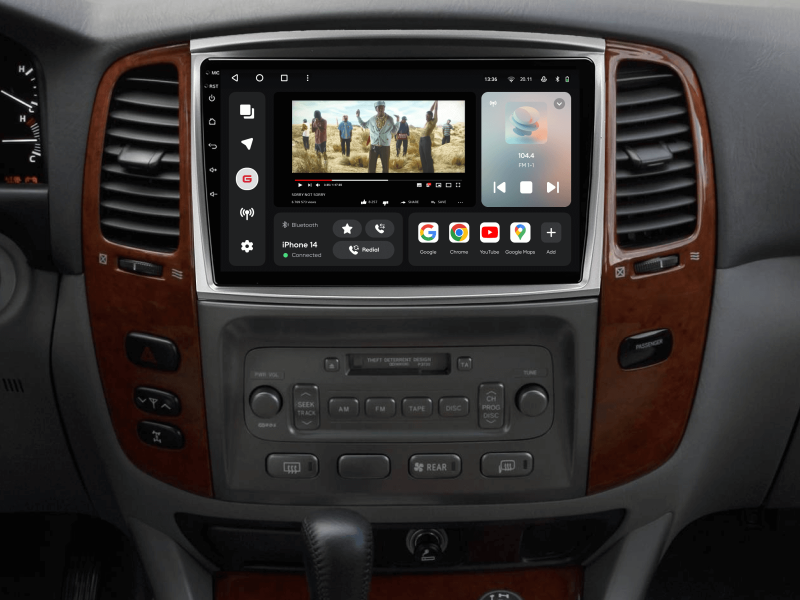 Отримайте Apple CarPlay, Android Auto, Google Maps та Wase навігацію з інформацією про затори на великому вбудованому екрані прямо у вашому автомобілі Toyota Land Cruiser 2002-2007. Насолоджуйтесь YouTube, Netflix, Amazon, Disney, а також інтернет-радіо та потоковою музикою у вашому авто.