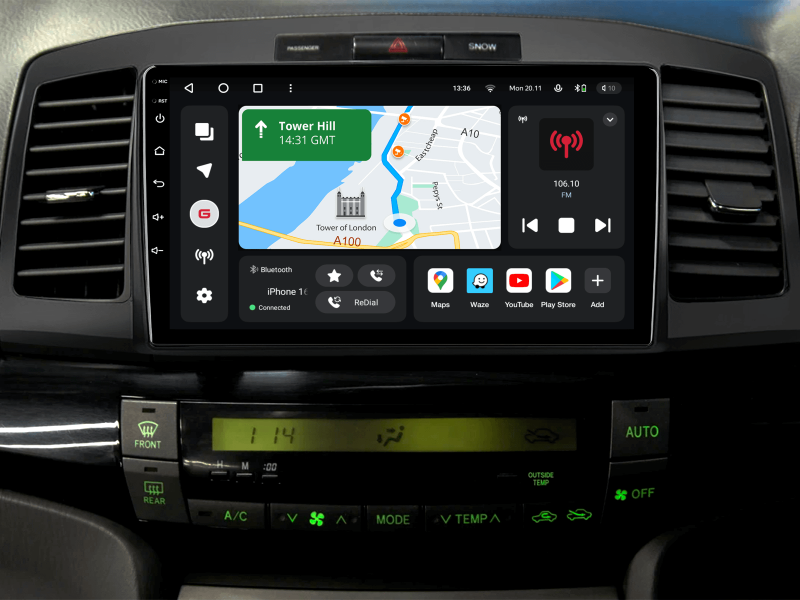 Отримайте Apple CarPlay, Android Auto, Google Maps та Wase навігацію з інформацією про затори на великому вбудованому екрані прямо у вашому автомобілі Toyota Allion | Premio 2001-2007. Насолоджуйтесь YouTube, Netflix, Amazon, Disney, а також інтернет-радіо та потоковою музикою у вашому авто.