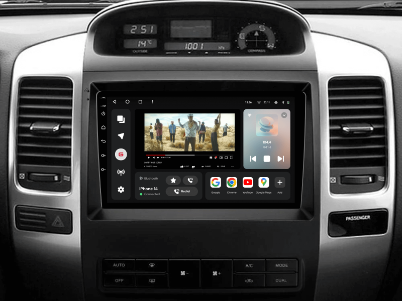 Отримайте Apple CarPlay, Android Auto, Google Maps та Wase навігацію з інформацією про затори на великому вбудованому екрані прямо у вашому автомобілі Toyota GX470 2002-2009. Насолоджуйтесь YouTube, Netflix, Amazon, Disney, а також інтернет-радіо та потоковою музикою у вашому авто.