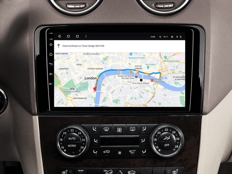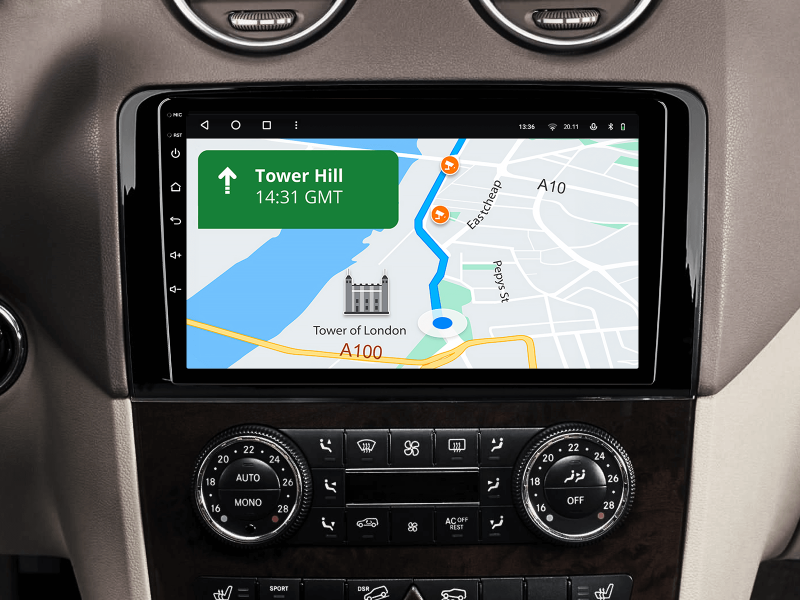 Отримайте Apple CarPlay, Android Auto, Google Maps та Wase навігацію з інформацією про затори на великому вбудованому екрані прямо у вашому автомобілі Mercedes-Benz GL | ML 2005-2009. Насолоджуйтесь YouTube, Netflix, Amazon, Disney, а також інтернет-радіо та потоковою музикою у вашому авто.