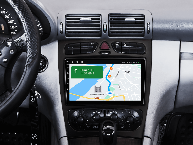 Отримайте Apple CarPlay, Android Auto, Google Maps та Wase навігацію з інформацією про затори на великому вбудованому екрані прямо у вашому автомобілі Mercedes-Benz C-Class 2000-2004. Насолоджуйтесь YouTube, Netflix, Amazon, Disney, а також інтернет-радіо та потоковою музикою у вашому авто.