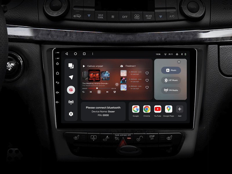Ви назавжди забудете про 6 звичних кнопок FM радіо, серед яких зазвичай обираєте музику в машині. Тепер ви зможете слухати будь-яку інтернет-радіостанцію будь-якої країни в цифровій якості без перешкод. Якщо ви фанат звичного FM, то насолоджуйтесь зручною навігацією по радіостанціях з обкладинками та RDS інформацією. Максимальна дальність приймання FM без перешкод — це візитівка Gazer multimedia system вже понад 10 років. Порівняйте з вашою штатною магнітолою Mercedes-Benz E-Class 2004-2010 — тепер улюблені станції грають на більшій відстані від міста без шипіння.