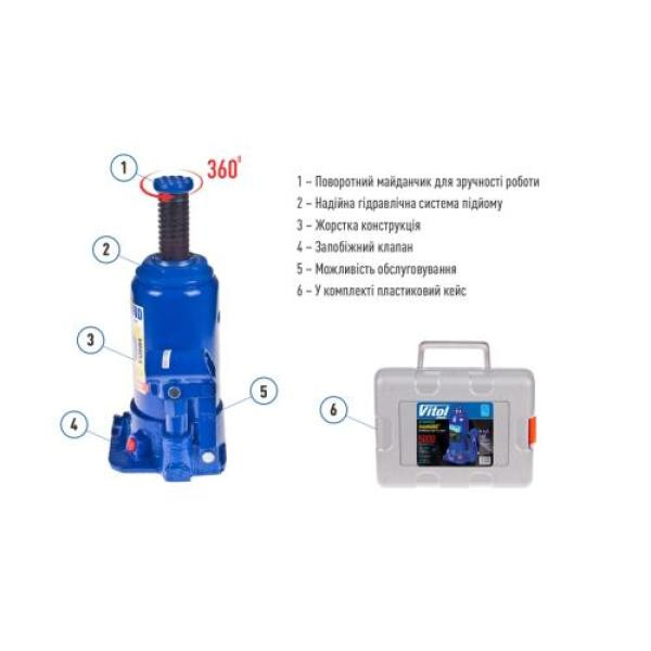 Vitol Iron HAND - це обмежена лінійка домкратів, виділена в окремий бренд та об'єднана однією загальною рисою - вигідна ціна при збереженні високої якості. Придбавши телескопічний гідравлічний домкрат IH-185355D-K, ви будете готові до будь-яких викликів, які може кинути вам автомобільне життя.